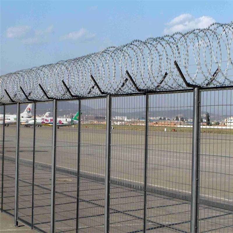 度和安全防御性級別很高的隔離柵產品。近年來,被廣泛應用在機場,軍事基地等高安全場所。注:如果在機場隔離柵頂部加裝刀片刺絲、刀