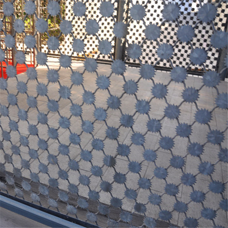 1、梅花刺片:梅花刺片直徑不小于7.5cm(直徑6cm、7cm、8cm),刺片厚1.5mm,采用Q235低碳鋼板沖壓成型。梅花刺片用氬弧焊將梅花形刺片焊接在美格網(wǎng)的節(jié)點(diǎn)上,形成刺形保護(hù),有效的防止了手握腳攀。