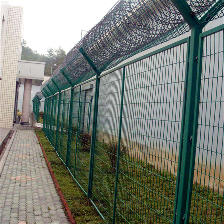 監(jiān)獄看守所圍墻防護阻隔網(wǎng)一般都是用刀片刺網(wǎng)與護欄網(wǎng)的結(jié)合體,由V型支架立拄,加強型焊接片網(wǎng),安全防盜連接件和刀片刺網(wǎng)組成,既安全環(huán)保又經(jīng)久耐用。圍墻防護阻隔網(wǎng)網(wǎng)格結(jié)構(gòu)簡練、防攀爬效果好,便于運送、安裝不受地形起伏限制,特別是對于山地、坡地、多彎地帶適應性強。