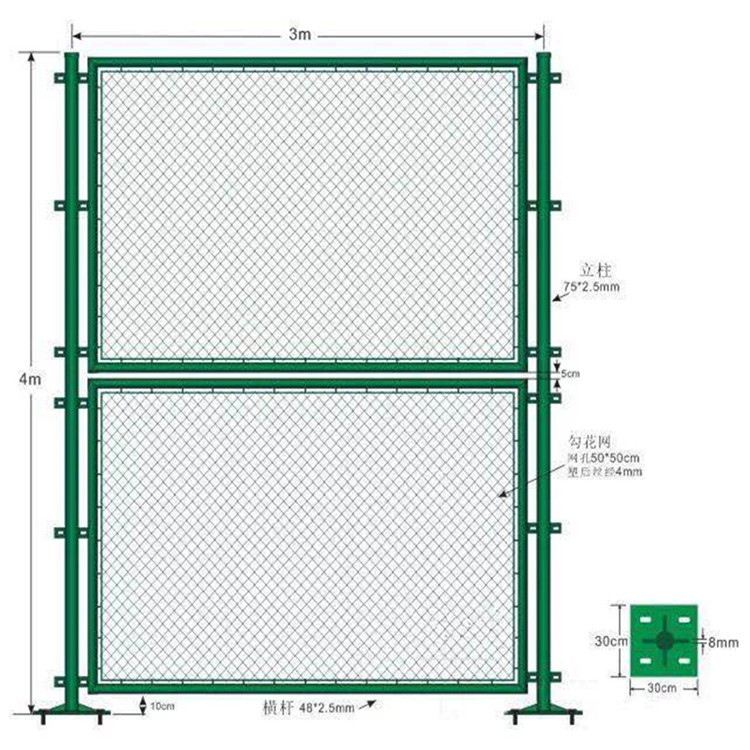 球場圍欄的高度標準是4米,可以分一層也可以分成兩層,這個根據(jù)用戶 實際需求和喜好。一層的是組裝式的,橫梁和立柱是分開的,一般常用的是橫梁用48圓管和60圓管這兩種比較多,厚度是保障要在1.8mm以上。