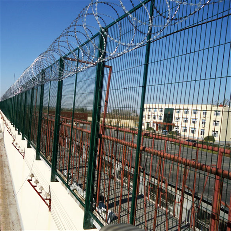 2:監獄鋼網墻用在放風場 警戒線內就需要做成2.5-5m左右的高度。上部加Y型柱,有效防止犯人的逃脫,因為上部會安裝刀片刺繩,對人也起到恐嚇的作用。