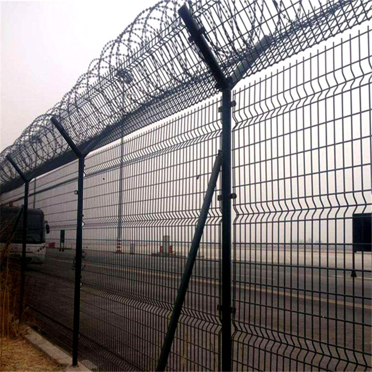 1、機場護欄網也被稱為機場護欄或Y型安全保護網,由V形支架立柱,加強焊接網片,安全防盜聯接件和熱浸鍍鋅刀片組成。