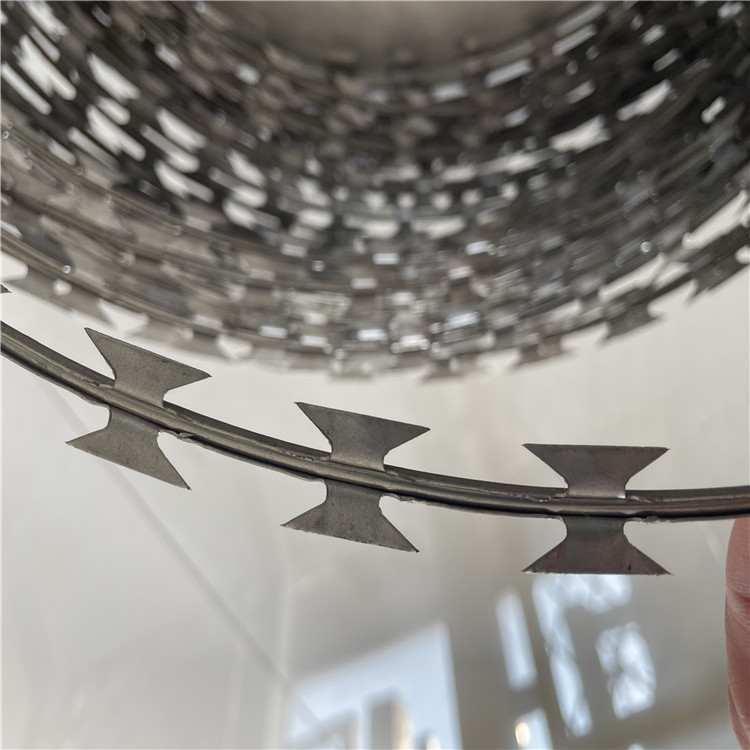 2.包絲 由熱鍍鋅鋼板或者不銹鋼板沖壓的刀片狀板條,包裹高張力鍍鋅鋼絲或者不銹鋼絲,形成半成品刀片刺繩。