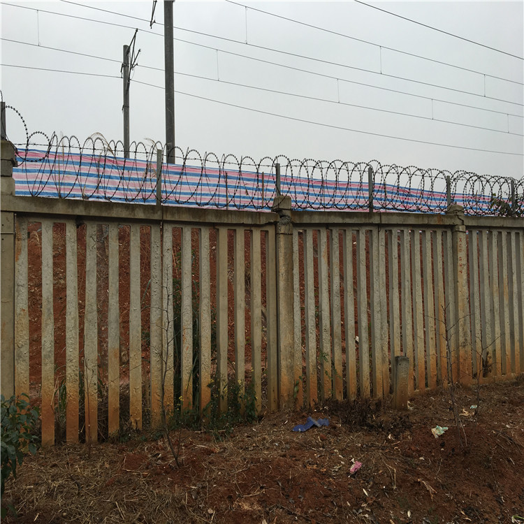 2、高鐵刺絲滾籠安裝前提是,鐵路線路的水泥防護柵欄安裝完畢時即可開始安裝高鐵刺絲滾籠,一般在水泥防護柵欄的基礎上加高0.5米的高鐵刺絲滾籠以增強防護能力。一般刺絲滾籠先安裝支架和加密支架后開始縱向拉筋和刺絲滾籠的安裝。安裝時需帶防割手套以防止手被割傷。