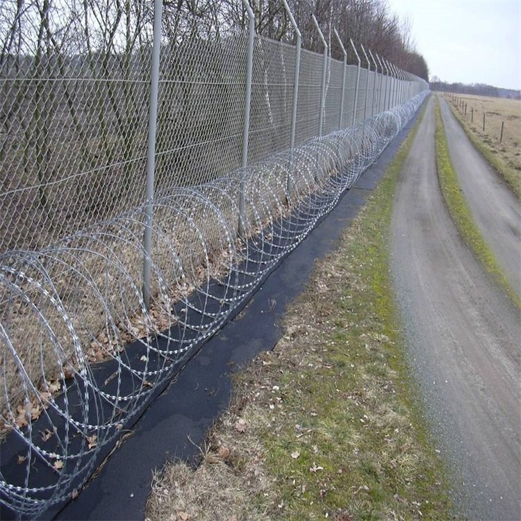 3、鍍鋅刺刀圈材料及安裝技術要求:鍍鋅刺刀圈材料:常用刀片刺網規格為BTO-22,刺圈直徑500mm,刀片長度22mm,刀片寬度15mm,刀片間距34mm,鍍鋅噴塑。鍍鋅刺刀圈規格為雙股2mm鐵絲捻扎而成,刺結間距102mm,鍍鋅防腐。鍍鋅刺刀圈安裝應控制在每米圍界范圍內有5個刺圈,即刺圈安裝間距20Omm,要求刀刺圈間距均勻,上下口平直。刺刀圈固定件為專用卡扣,使用專用工具固定在鋼圍界刺繩上,卡扣不得有松動現象,保證刺網安裝牢固。