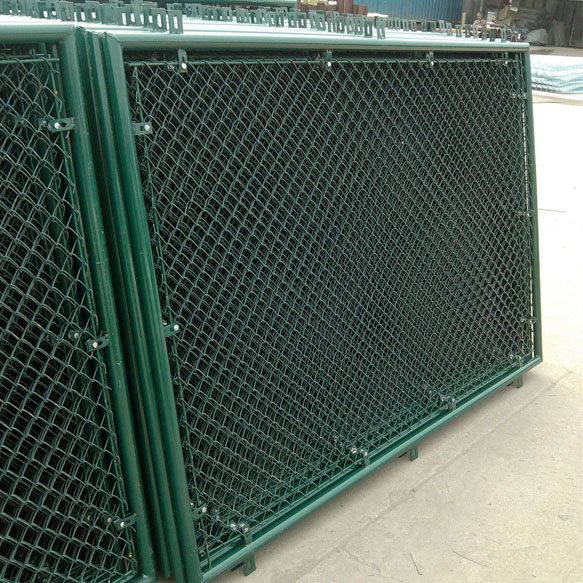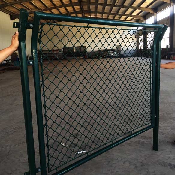 球場圍網由圍網框架+整體式拉網模式,結構簡單耐用,整體效果好,性價比高。圍網的骨架通過直通、三通、四通等專用扣件將立柱和橫梁連成整體呈”口”或”日”字型,用高強度螺栓固定,圍網高度為4000mm,兩立柱間距三米左右;待圍網骨架搭建成型后,現場整體張拉圍網,并用扁鐵固定在骨架的立柱及橫梁上。【配備1個1200mm*2000mm的單開式框架門】
