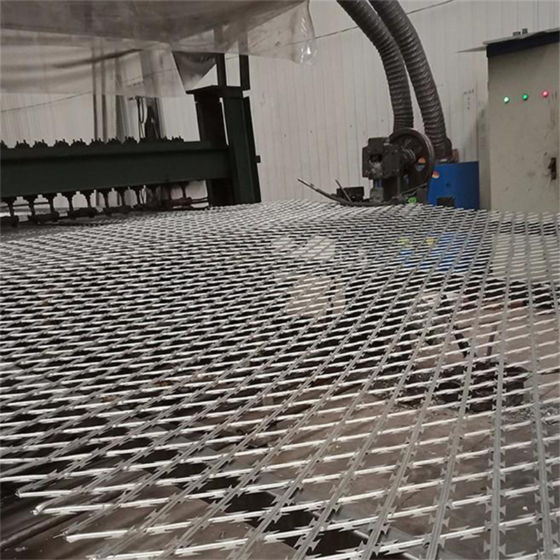2、焊接刀刺網成型:把沖好的刀片裹在熱鍍鋅絲上面,經調直達到預定的長度自動切斷,送入到模具內,排焊機把經和緯相交叉的部分,沖